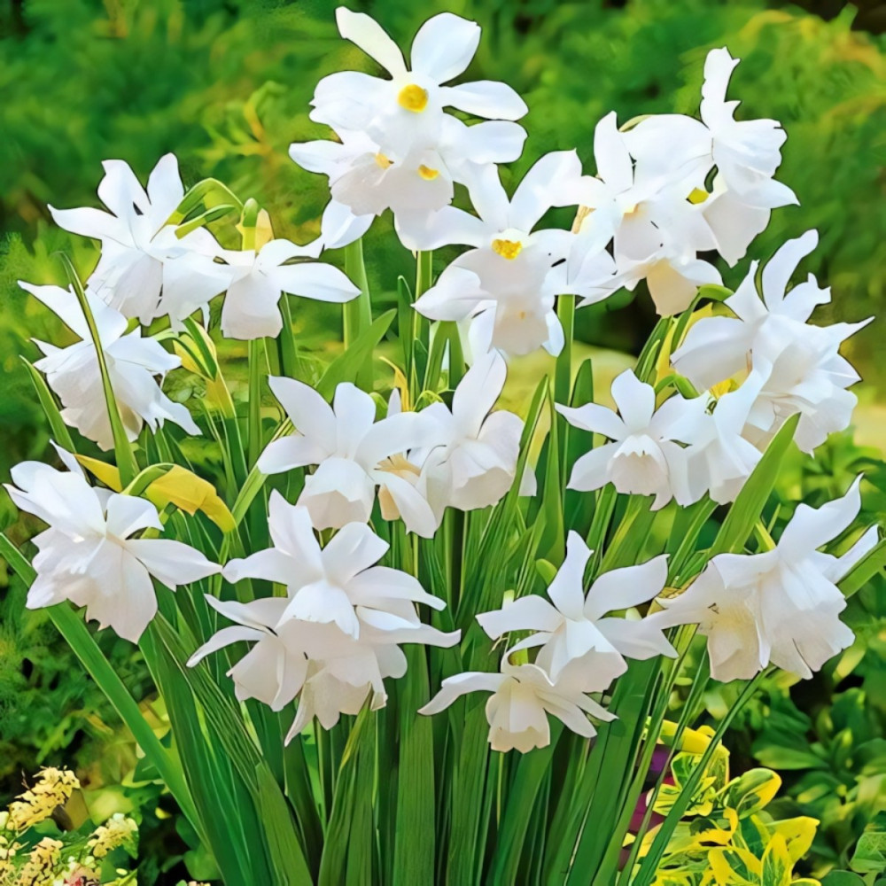 Нарцисс мини Тхалия – эффектный луковичный многолетник с очаровательными белоснежными цветами. Иногда окраска коронки цветов смещается в сторону кремового или молочного оттенка. Карликовое растение не вырастает выше 20-25 см. Срок цветения – с мая по июнь.