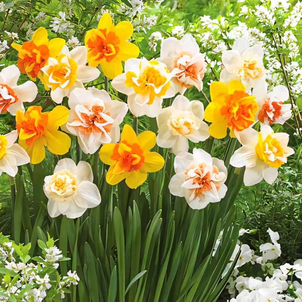 Махровые нарциссы великолепны! Их нежные лепестки сложены в изящные складки, а венчающая сердцевину коронка подобна пышному жабо из кружевных рюшей, окрашенных в контрастные цвета. В смесь махровых сортов мы включили культуры:
