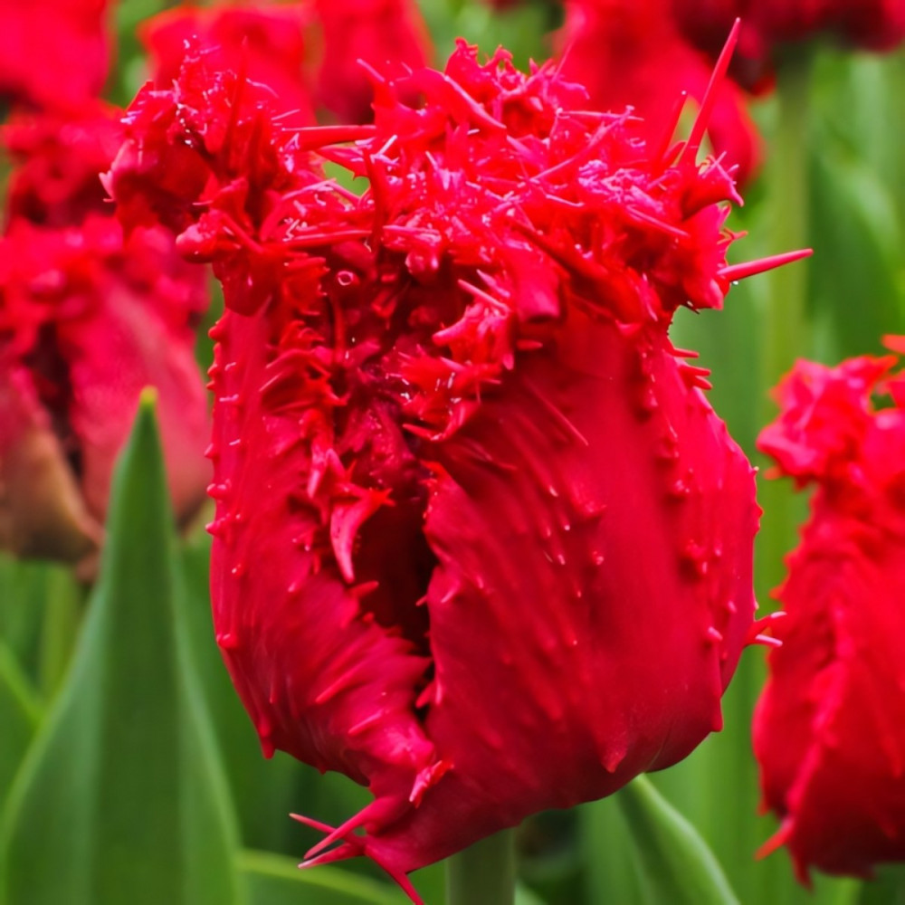 Тюльпан бахромчатый Барбадос – уникальный сорт с шикарными цветами пронзительно-алого оттенка. По краю лепестков проходит густая бахрома, что добавляет шарма и без того эффектному цветку. Лепестки с наружной стороны покрыты небольшими шиповатыми выростами, это придает объем бокалу тюльпана. Яркий и запоминающийся сорт. Срок цветения – с апреля по май. Высота стебля – до 50 см.