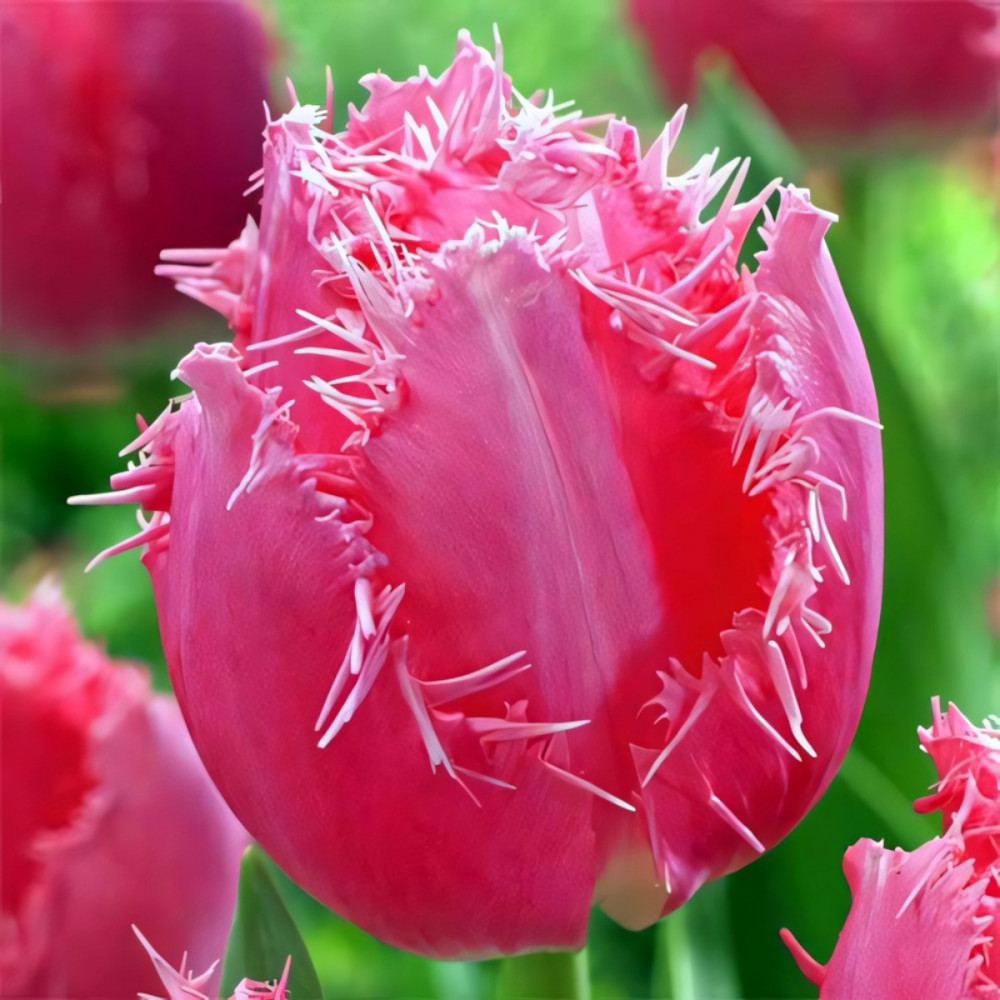 Тюльпан бахромчатый Кашарель – изумительный по красоте цветок. Розовые бахромчатые цветы тюльпанов, отрастающие из центра луковицы весной, отлично смотрятся на садовых клумбах в качестве акцента. Розовое наслаждение – цветы напоминают клубничную карамельку. Высота стебля – 40 см.