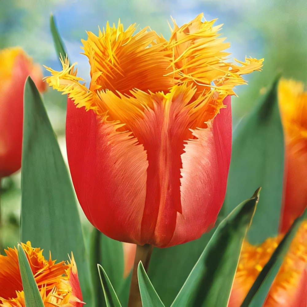 Тюльпан Ламбада — оранжево-желтый бахромчатый сорт с крупными декоративными бокалами, выведенный для озеленения и выгонки под срезку. Лепестки ярко окрашенные, с выраженной желтой игольчатой бахромой по краю. Цветение наступает в мае. Растения подолгу стоят на клумбе и в срезке без потери декоративности. Зимуют в грунте.