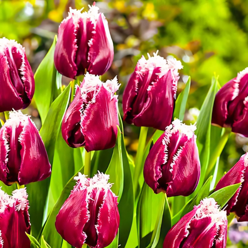 Тюльпан бахромчатый Сан Пабло – это красивейший луковичный многолетник с темно-бургундовыми лепестками, украшенными по краю тонкой снежно-розовой игольчатой бахромой. Сорт-шедевр! Расцветают удивительные цветы весной, при благоприятных погодных условиях любоваться изящным тюльпаном можно с середины апреля по май. Высота стебля тюльпана достигает около 40-50 см, сорт прекрасно подходит для выращивания в цветниках и на срезку.