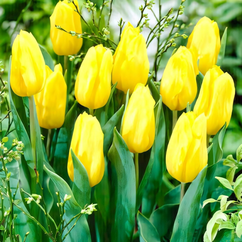 Тюльпан Дарвина Голден Оксфорд – эффектный и яркий сорт с желтыми крупными цветами. Листья крупные, зеленые, сочные. Имеет высокий коэффициент размножения, отлично цветет каждый год даже из крупной детки, прекрасно переносит холодные зимы. Высота растения – около 60 см. Высота бокала – 8 см.