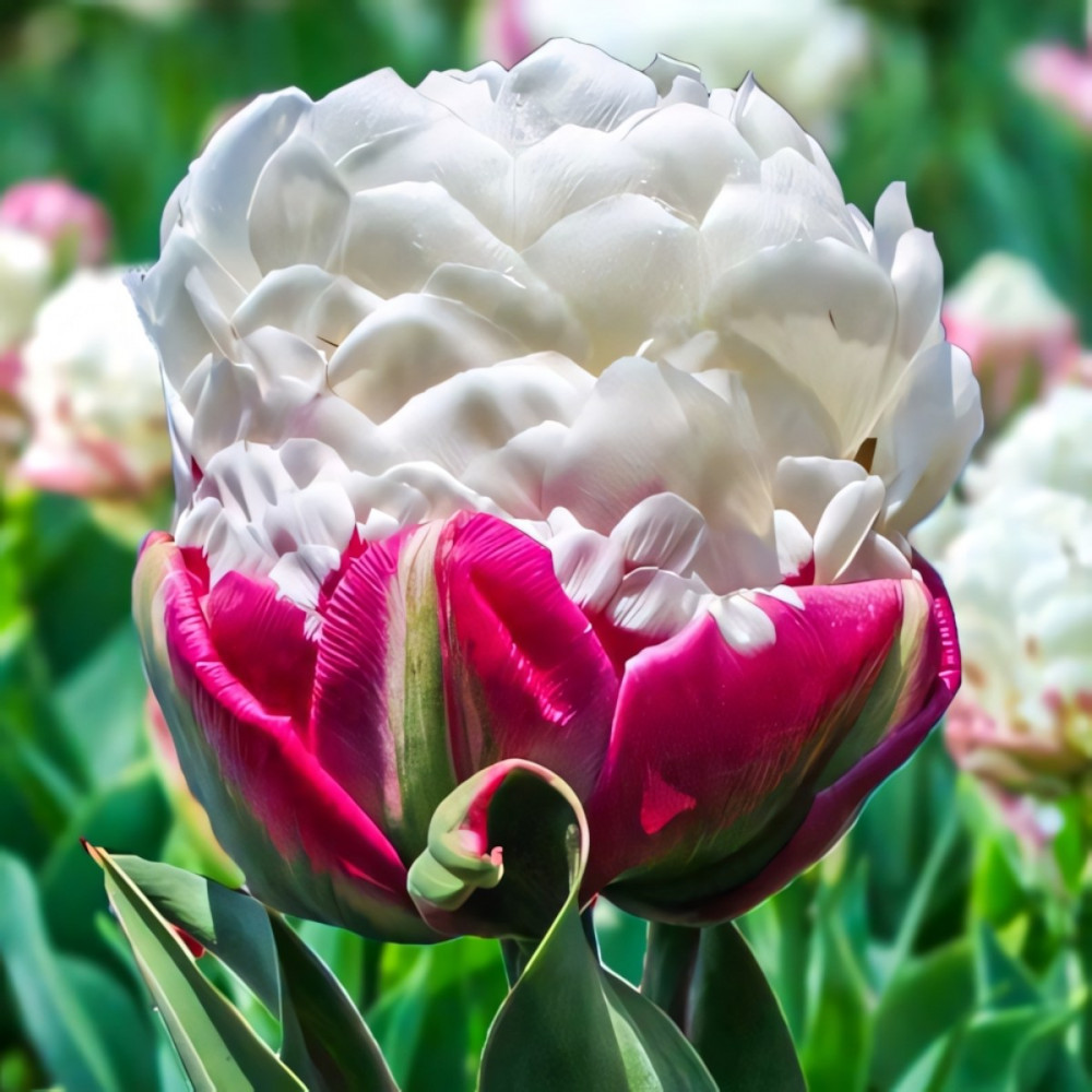 Фантастика - это не просто махровый тюльпан, это неповторимый шедевр мировой селекции! Цветок напоминает мороженое, положенное горкой в изящную красную вазочку. Пенное великолепие снежно-белых махровых лепестков возвышается над красноватой короной. Очень эффектный сорт позднего цветения позволит продлить на клумбах фестивальное шествие тюльпанов.