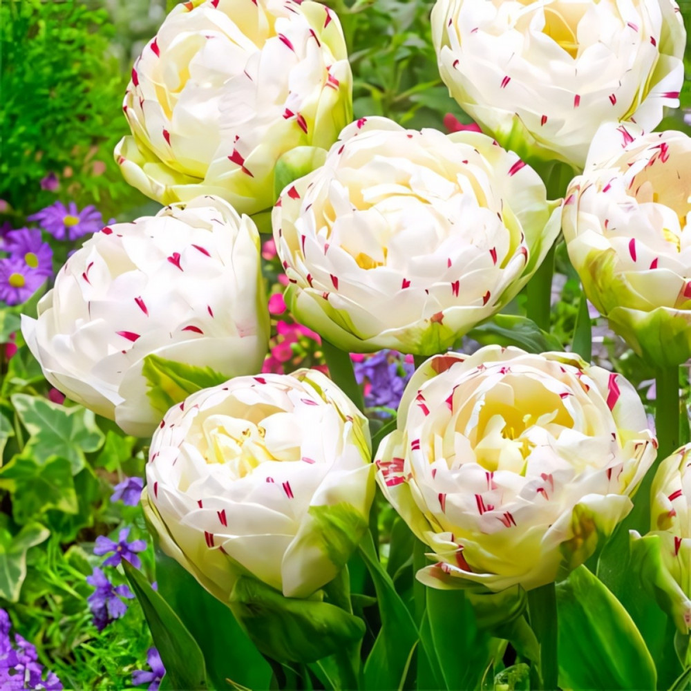 Пышный махровый цветок жемчужного цвета с красными штрихами по верху лепестков – это тюльпан махровый Дэнс Лайн, роскошный и изумительный. На каждой клумбе этот сорт заметен и эффектен. Тюльпан прекрасно подходит для выращивания на срезку, из этих цветов легко создать эксклюзивные букеты.