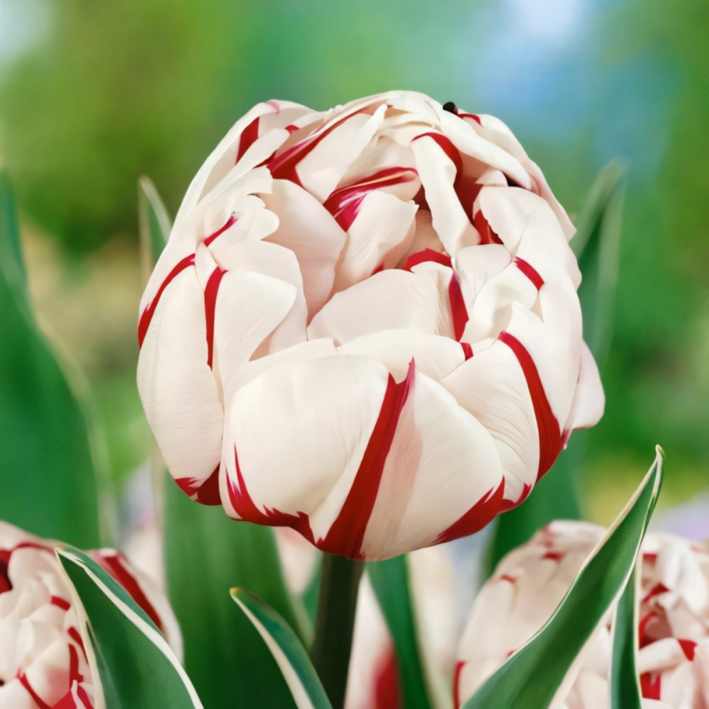 Тюльпан Карнавал де Найс — красавец с махровым бело-розовым цветком. При полном раскрытии пышный бутон с множеством лепестков достигает в диаметре 10 см. Растение цветет в мае. Сорт используют для оформления клумб и бордюров, выращивают в контейнерах и на срезку.