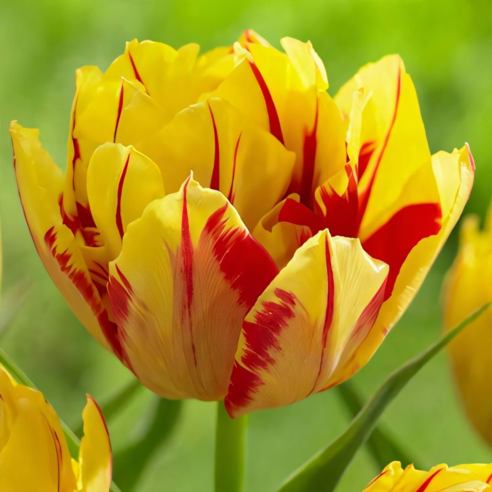 Тюльпан махровый Монселла – это уникальный сорт раннего срока цветения с махровыми цветками красно-жёлтой окраски. По жёлтому полю идут хаотичные мазки рубиново-красного тона – каждый цветок разный. Высота растения – от 25 до 35 см. Цветение начинается в апреле.