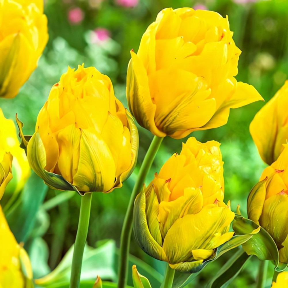 - Оригинальные эффектные цветы ярко-желтого оттенка с махровыми лепестками.