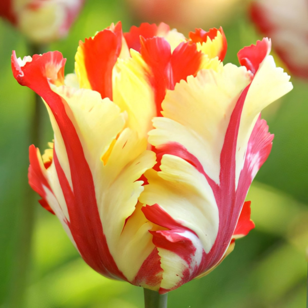 Тюльпаны Флеминг Пэррот Голд — поздноцветущий сорт класса Попугайных, привлекает садоводов своим оригинальным жизнерадостным видом. В одном бутоне собраны несколько цветов: зеленый, желтый и красный. Издалека может показаться, что на участок залетело несколько экзотических пернатых.