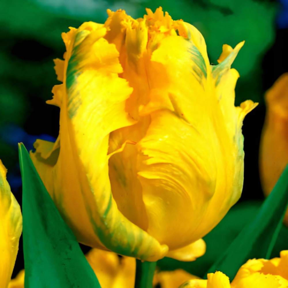 Тюльпан попугайный Йоко Пэррот — яркий чисто желтый сорт с ровно окрашенными гофрированными лепестками, которые образуют крупный бокал высотой 10 см и более. Ровные однотипные растения хорошо смотрятся на клумбе, годятся для выгонки под срезку, подолгу стоят в букетах, а в открытом грунте не теряют формы и цвета на протяжении 3 недель. Цветоносы достигают 30 см.