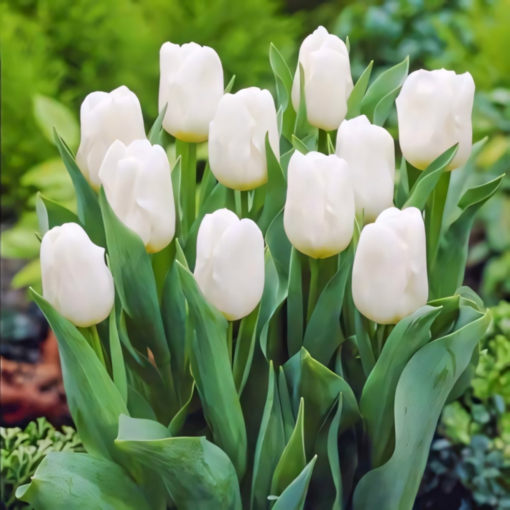 Тюльпан Триумф Антарктика – это раннецветущий сорт с остроконечными листьями и белоснежными бокаловидными цветами. Высота цветоносов – от 40 до 60 см. Диаметр цветка – от 7 до 9 см. Сорт используется для украшения садовых цветников, выгонки, выращивания для букетной срезки.