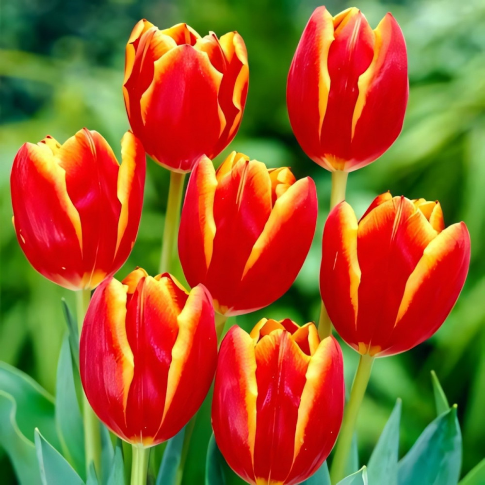 Тюльпан Триумф Лаура Фьюджи – изумительный яркий многолетник с крупными цветами оранжево-красной окраски. По краю каждого лепестка проходит желтая элегантная кайма. Высота растения – около 50 см. Ножка тюльпана плотная, прочная, сорт прекрасно подходит для выращивания для букетной срезки.