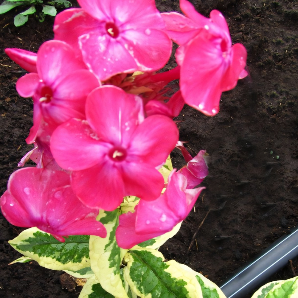 Насыщенно-розовый, иногда с лёгким высветлением в центре. Цветок колесовидной формы. Лепестки слегка волнистые. Соцветие округлое, довольно плотное. Куст прямостоячий, прочный. Лист зелёный с широкой неравномерной кремовой каймой. Цветение продолжительное.