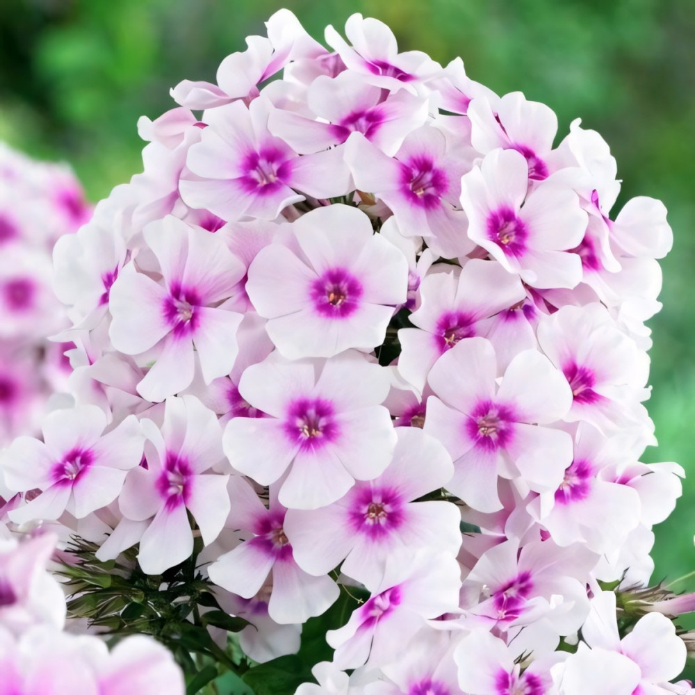 Флокс метельчатый образует куст компактный, хорошо облиствленный. Стебли прочные прямостоячие. На их концах образуются плотные конические соцветия, которые в свою очередь состоят из больших пятилепестковых цветков. Цветки белые с малиновым глазком, и такими же по цвету, штрихами. Листья ланцетные, удлиненные, супротивные.