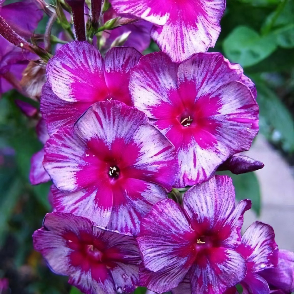 Флокс метельчатый Дракон. Растение высотой 80-90 см. Темно-пурпурно-фиолетовый с серыми штрихами по краям и маленьким карминным колечком. Очень оригинальная расцветка. Классика!