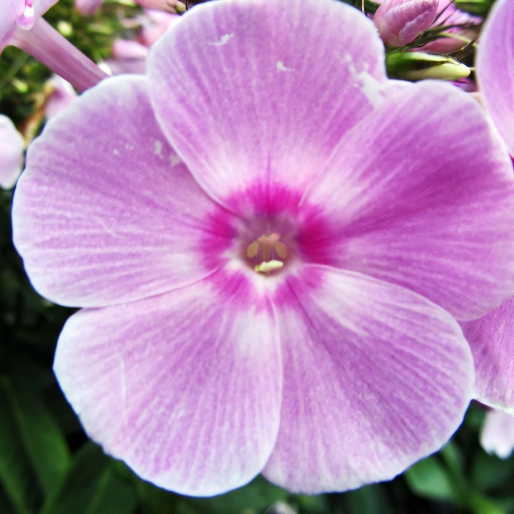 Флокс светло-розовый с сиреневым оттенком и малиновым глазком, края лепестков завернуты вниз. Соцветие овальное. Куст прочный, устойчивый. Высота куста - 70-80 см.