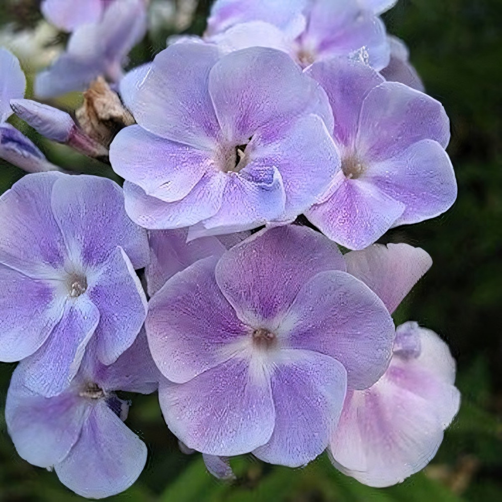 Нежно-сиреневый с белым центром. Бутоны сиренево-фиолетовые. Соцветие округлое, среднего размера и плотности. Куст слегка раскидистый.