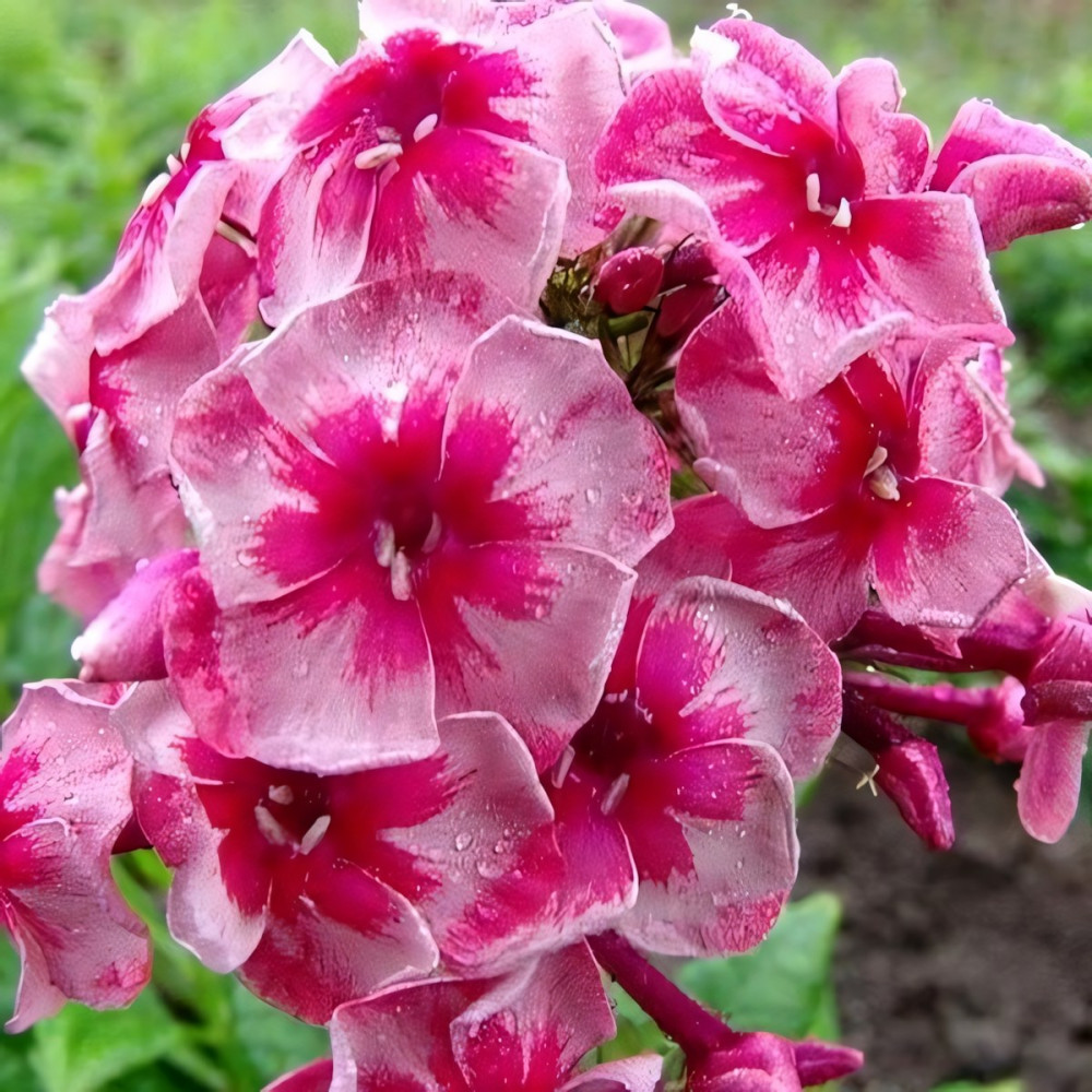 Крупноцветковый флокс с очаровательными, необычно окрашенными цветками. Лепестки ало-розовые с малиновыми и серебристыми штрихами, с ярко-алым горлом. Стебли прочные, прямые, к концу вегетации одревесневающие. Цветение обильное. Для посадки наиболее подходит полутень, так как на солнце цветки выгорают, а в тени растение - плохо цветет. Неприхотливый многолетник, но лучше растет на рыхлой, хорошо удобренной, влажной почве. Быстро разрастается.