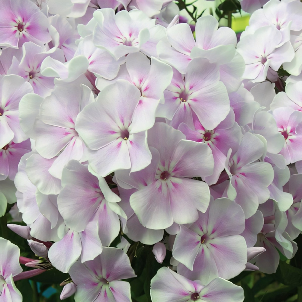 Цветок блюдцевидный, белый, очень крупный (4 см) с пурпурными тенями, к центру тени гуще, не выгорает. Соцветие округло-коническое, плотное, большое. Сорт создает ощущение воздушности благодаря светящейся, перламутровой окраске.