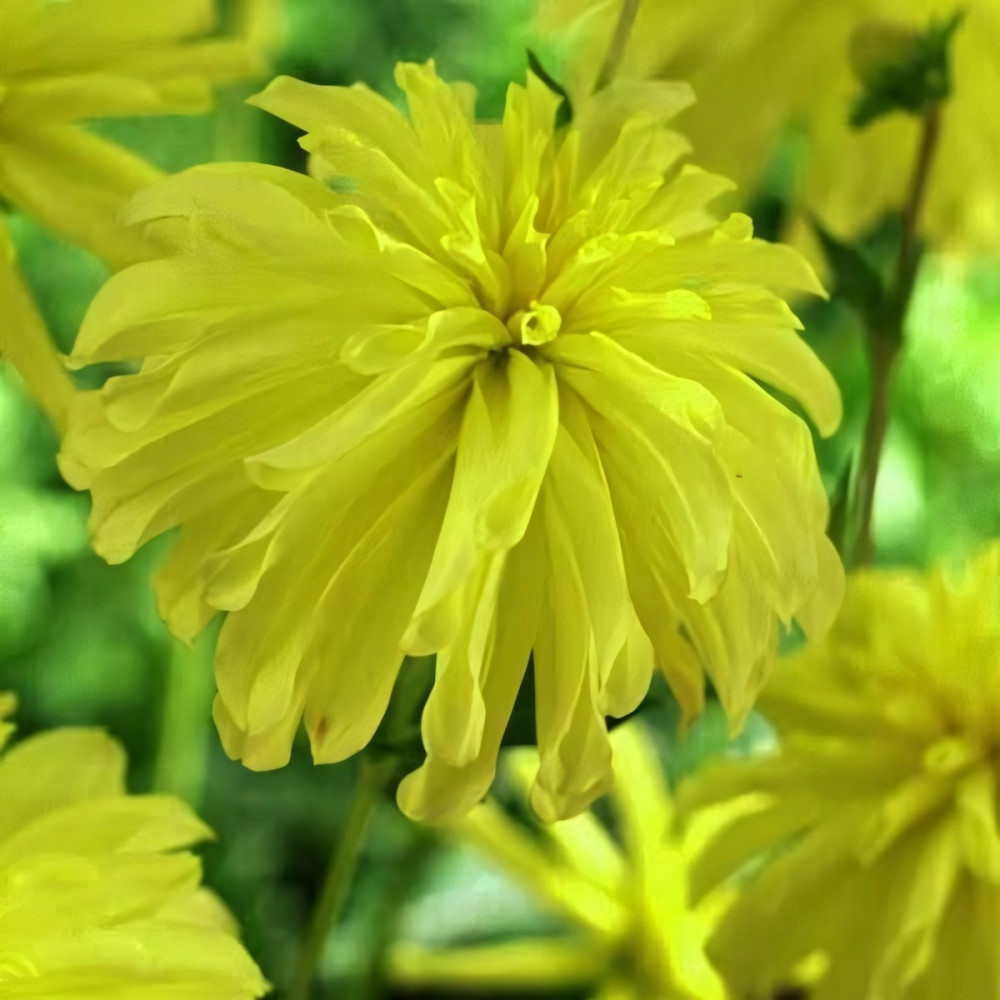 Георгина декоративная California Sunset (Калифорния Сансет) - однолетнее клубневое растение группы Декоративных георгин. Куст мощный, пышный, стебли полые высотой 110 см. Листья перистые, темно-зеленые, многочисленные. Соцветие махровое, желтое. Длинные лепестки скручиваются по длине и свисают фонтанчиком. Диаметр цветка - 15-17 см. Предпочитает солнечные места, защищенные от ветра, плодородные хорошо дренированные почвы.