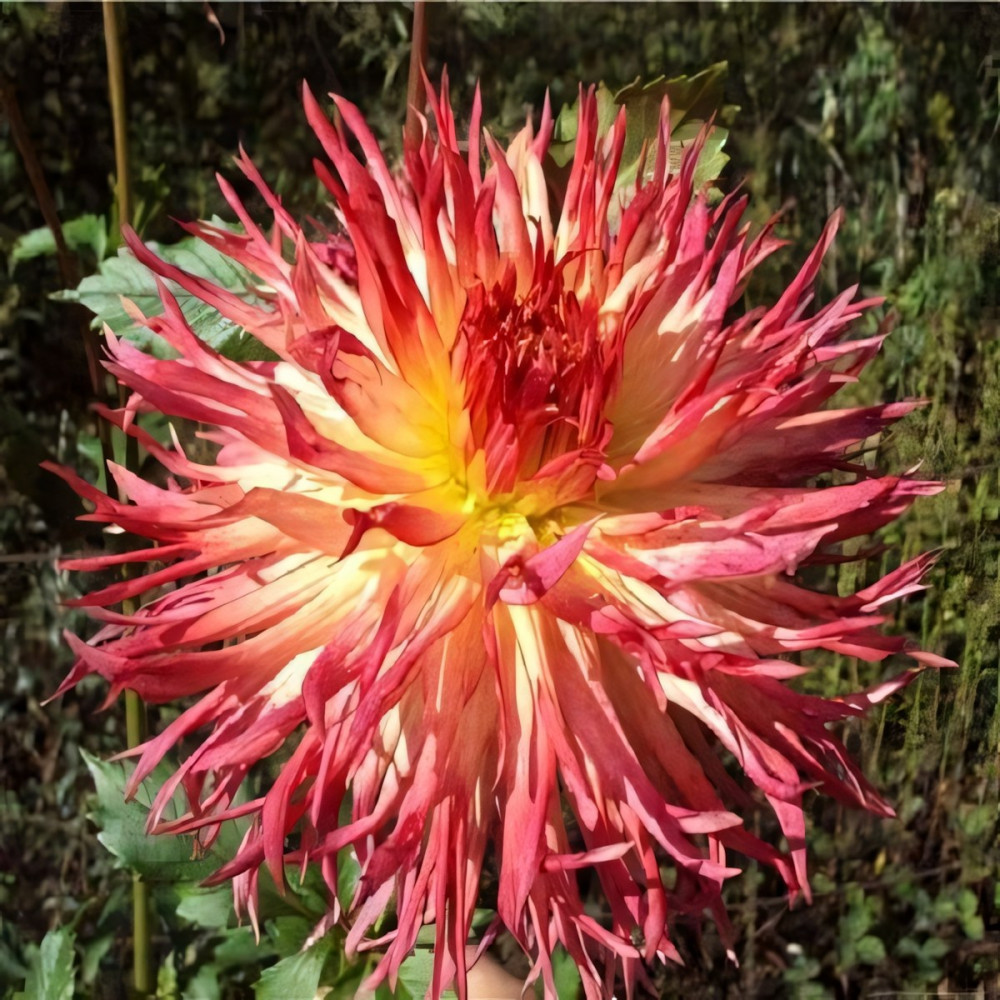 Цветение: коралловый с жёлтым центром, расщеплённые кончики.