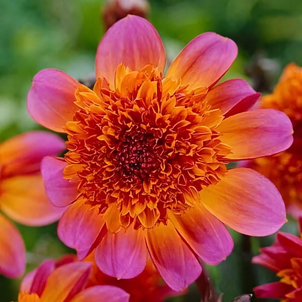 Георгина анемоновидная Floorinoor (Флоринор) - высота растения 100 см. Невероятно эффектный цветок. Наружные лепестки нежно-розовые, ближе к серединке — золотисто-жёлтые, и приобретают бордовый оттенок в центре. Диаметр цветка 5-12 см.