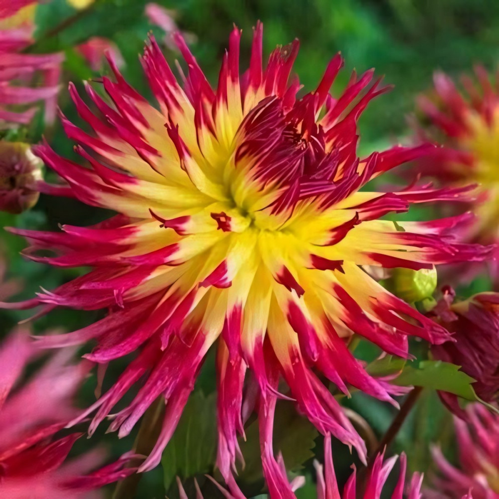 Георгина бахромчатая Lindsay Michelle (Линдсэй Мишель) - красивая, экстравагантная георгина с крупными цветками. Лепестки желтые, тонкие, свернутые у краев, кончики - ярко-розовые, чуть рассеченные. Сорт образует куст высотой 90-100 см. Цветы георгины достигают 15-20 см и имеют легкий тропический аромат. Цветет в период с июля по сентябрь.