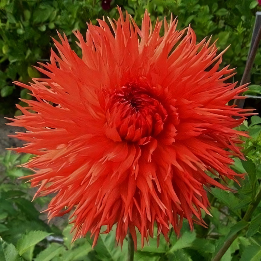 Георгина бахромчатая Mel's Orange Marmelade (Мелз Оранж Мармелад) - махровый остролистный сорт. Цветки из сотен ярко-алых крупных остроконечных лепестков похожи на огромные яркие вечерние звезды. Стебли стройные, прямостоячие, упругие, с насыщенной темно-зеленой листвой, достигают в высоту 120 см.