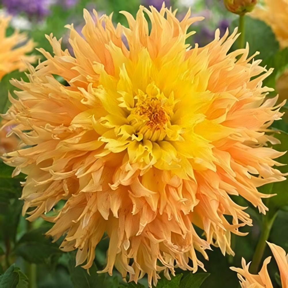 Георгина бахромчатая Mingus Joshua (Мингус Джошуа) - бахромчатая георгина – выведена в США в 1990 годах. Селекционеры прикладывали большие усилия, стремясь вывести бахромчатые сорта с высокой устойчивостью к холоду и крупными цветками. Цель была достигнута – большая часть сортов «Мингус» дают соцветия диаметром более 20 см, все цветки не боятся ночных похолоданий и хорошо цветут даже осенью. Кустики независимо от подвида вырастают небольшими: до 110 см в высоту. Диаметр цветка 15-16 см. Привлекает внимание насыщенными лимонными лепестками, рассеченными на концах, что делает цветок ещё более объемным и декоративным. Части требуется обязательная подвязка, без которой стебель может сломаться из-за большого веса соцветий или порывов ветра.