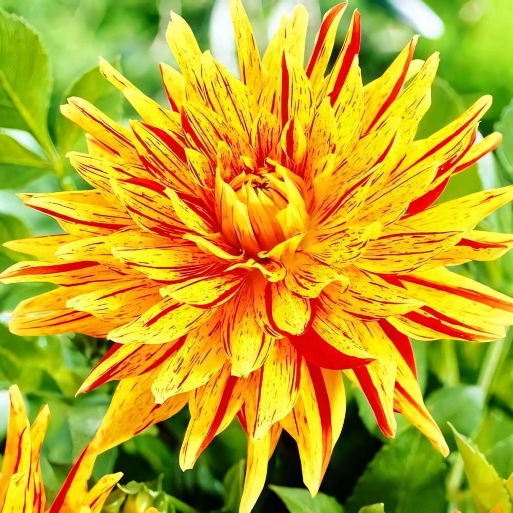 Удивительно красивый сорт. Его характерной особенностью являются эффектные цветки непривычной формы и невероятной окраски. Цветы крупные, каждый лепесток скрученный, с острым окончанием. Цвет желтый с красными линиями и белыми кончиками.