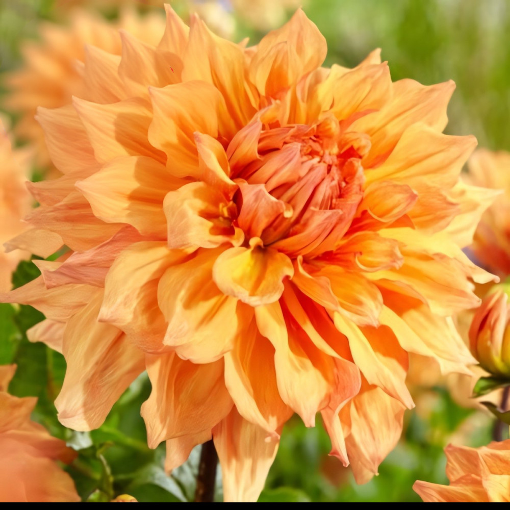 Георгина декоративная макси Ben Huston NEW (Бен Хьюстон) - эффектное многолетнее растение. Цветок махровый, желто-розовый меланж с преимуществом желтого; широкие, плоские язычковые цветки, слегка закручены и заостренные на кончиках. Куст мощный, пышный, стебли полые. Листья перистые, темно-зеленые, многочисленные. Цветет обильно и продолжительно. Предпочитает Георгина декоративная макси Ben Huston NEW (Бен Хьюстон) солнечные, защищенные от ветра места, плодородные хорошо дренированные почвы. Не требует дополнительных опор. Устойчива к неблагоприятным условиям, к болезням и вредителям. Используется для групповых посадок.