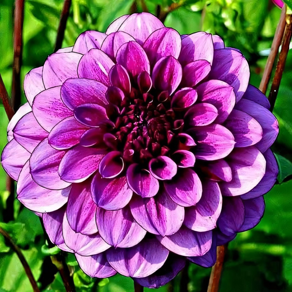 Георгина декоративная Blue Bell (Блю Белл) - клубневое растение группы Декоративных георгин. Цветок махровый, ярко-розовый с лиловым меланжем, вокруг лепестков тонкий лиловый кант, диаметром 15 см. Плоские язычковые цветки заостренные на кончиках и слегка закрученные и отогнутые к стеблю. Листья перистые, тёмно-зеленые, многочисленные. Куст мощный, пышный, стебли полые высотой до 90 см. Цветет обильно и продолжительно с июля по сентябрь. Предпочитает солнечные, защищенные от ветра места, плодородные хорошо дренированные почвы. Используется для групповых посадок и на срезку. Не требует дополнительных опор. Устойчива к неблагоприятным условиям, к болезням и вредителям.
