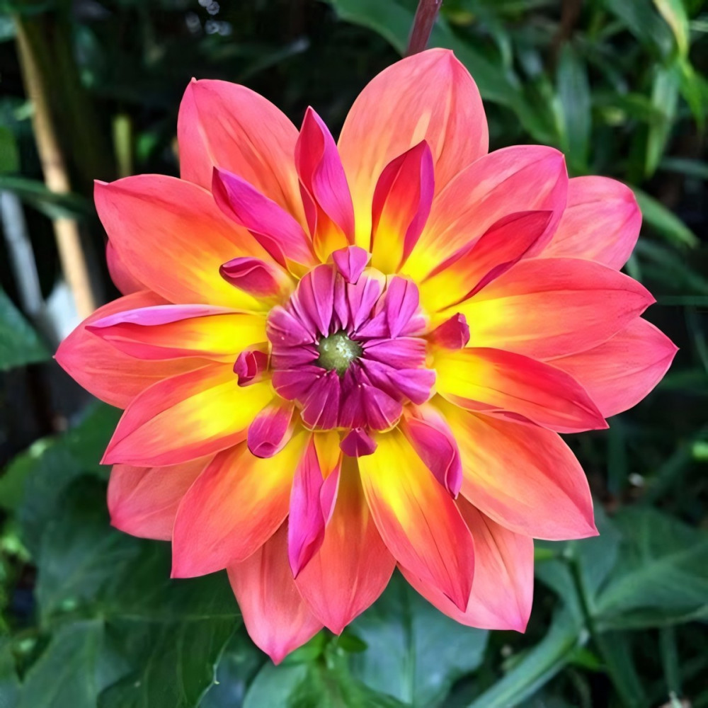 Георгина декоративная Firepot (Файрпот) - высота растения 80 см. Цветок не крупный, диаметром до 10 см, "подсвеченный" изнутри ярким желтым цветом. Лепестки оранжево-кирпично-красные. Прекрасно смотрится на фоне изумрудно-зеленой листвы. Идеален для срезки.