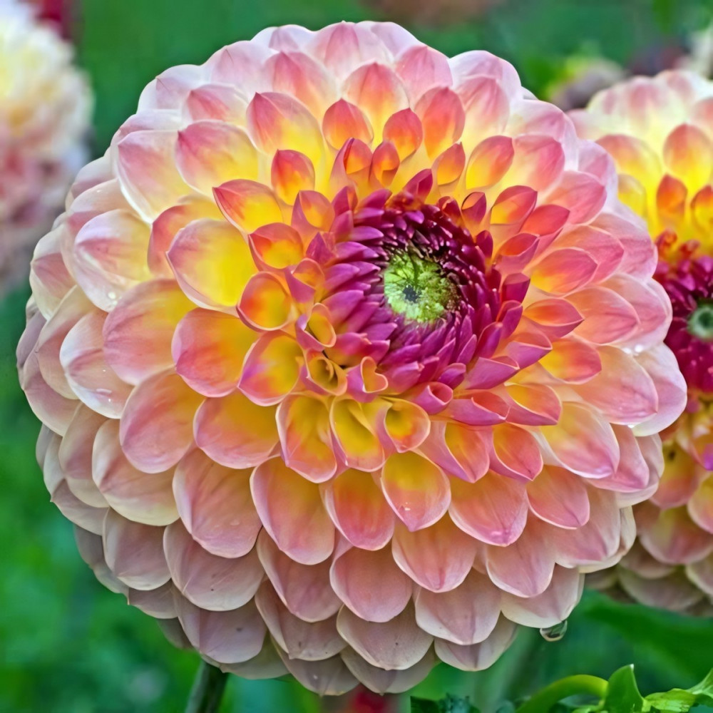 Георгина декоративная Lakeland Autumn (Лейклэнд Отумн) - (шаровидная) – клубневое растение высотой 120см. Привлекательные желто-розовые цветки достигают 10-15см в диаметре и служат замечательным украшением сада. В зависимости от сорта на шаровидных георгинах могут одновременно распускаться до 25 цветков, каждый из которых благодаря своим плотно упакованным свернутым лепесткам (язычковым цветкам) похож на слегка сплюснутый шар.
