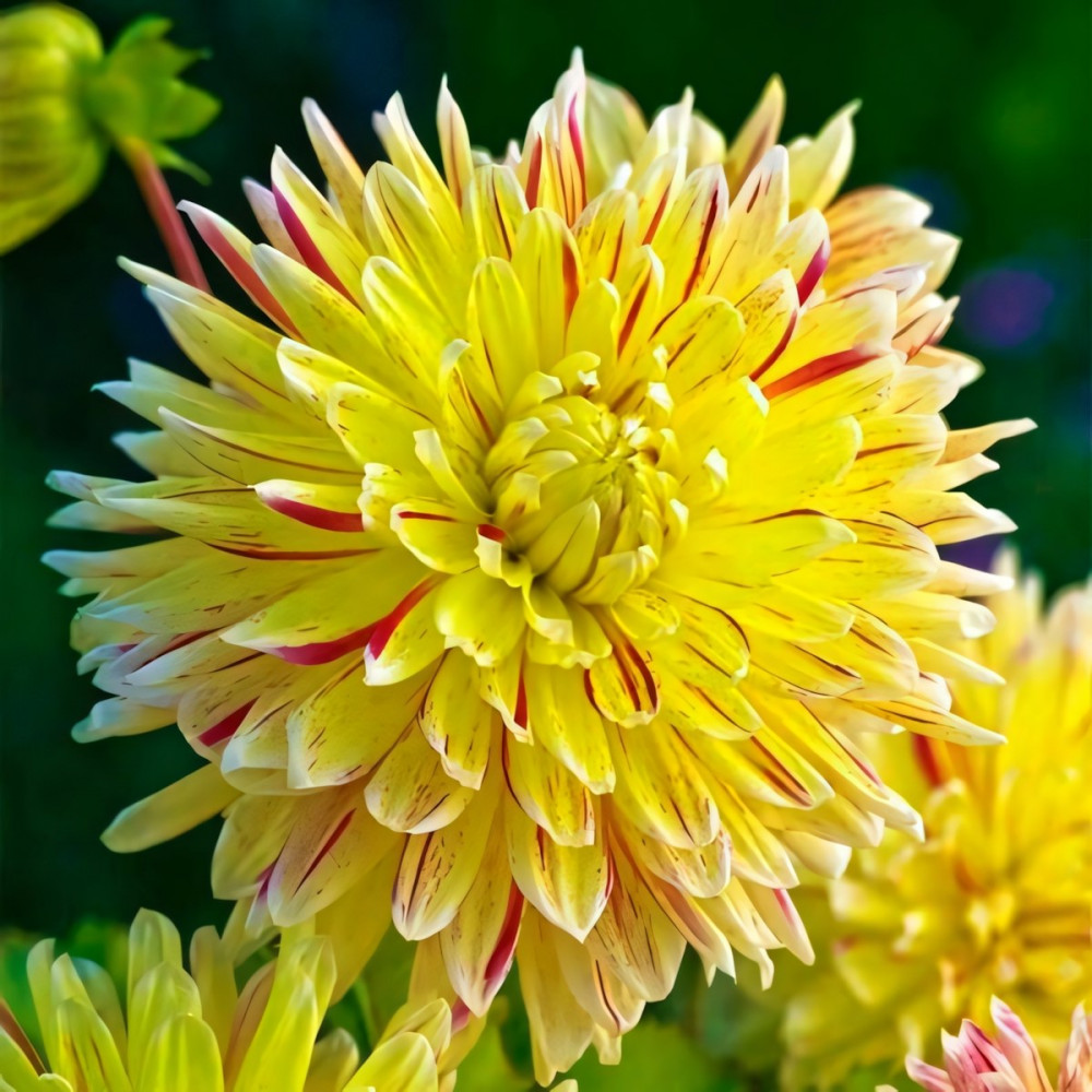 Многогранная и красочная. Цвет желтый с бордовыми штрихами. Куст крупный с огромными бутонами. Стебли плотные, не требующие опоры. Высаживают георгины на хорошо освещенных, защищенных от ветра местах. Предпочитают легкую, плодородную землю. Цветет продолжительно с июля по сентябрь. Для более обильного цветения удаляют боковые бутоны. Идеально подходит для срезки, так как цветы долго стоят в букете.