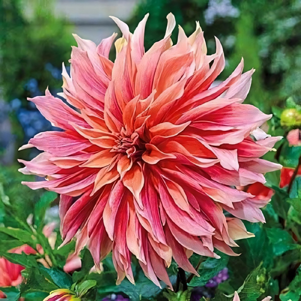 Георгина декоративная макси Labyrinth (Лабиринт) - высота растения 90 см. Цветок диаметром 18 см. Ярко-розовый центр с кремово-розовыми краями, лепестки подкручиваются.