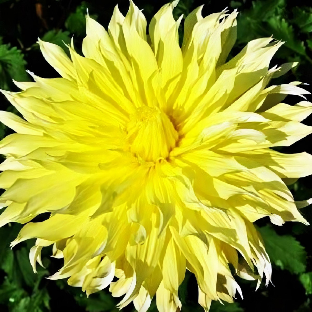 Георгина декоративная макси Ponderosa (Пондероза) Имеет очень продолжительный срок цветения. Данный вид обладает крепкими стеблями, которые не ломаются даже при сильном ветре. Высота растения 100 см. Цветок очень крупный, диаметром 25 см, желтый. Заостренные лепестки слегка закручены. Предпочитает солнечные, защищенные от ветра места, плодородные хорошо дренированные почвы.