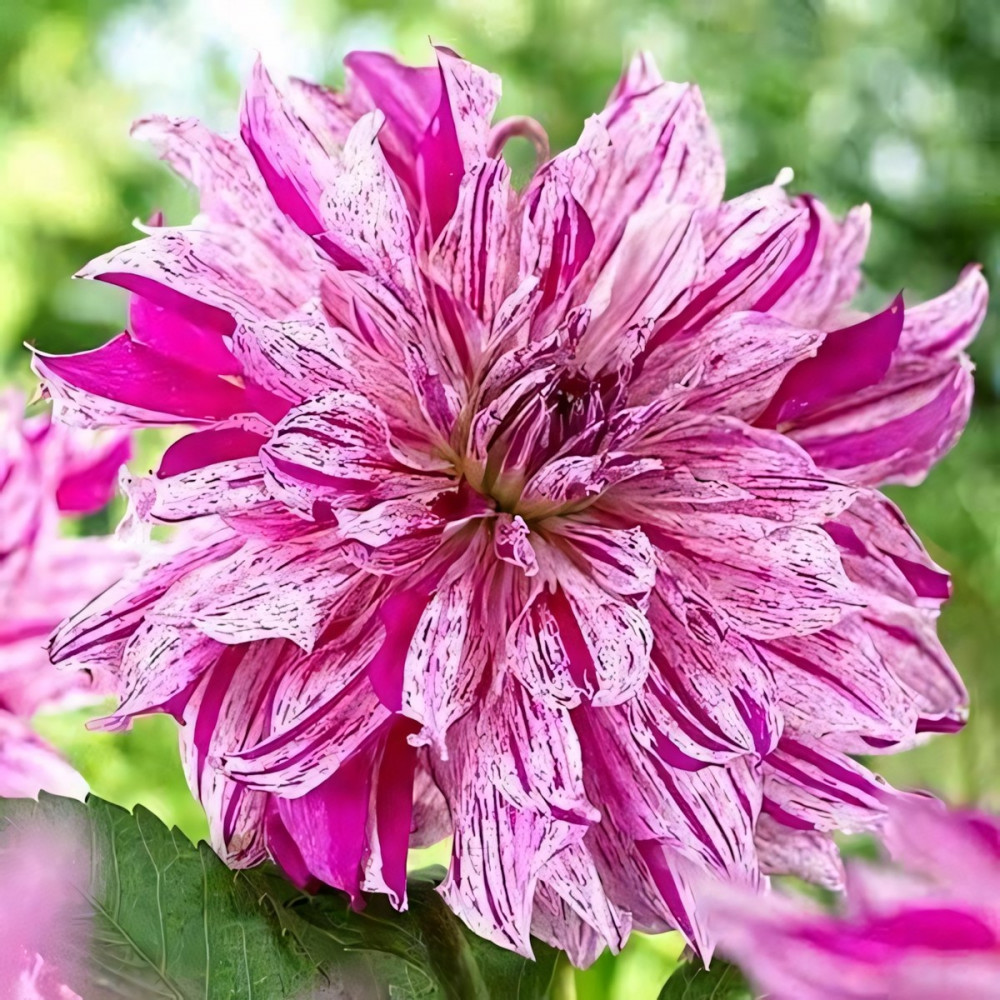 Георгина декоративная макси Taiheiyo (Тайхейо) крупноцветковый сорт. Высокие прочные стебли украшают махровые цветы, поистине гигантского диаметра. Этот сорт имеет очень необычную окраску. Белые лепестки расцвечены малиновыми вкраплениями: штрихами, полосами. Является великолепным украшением любого сада. Цветет продолжительно с июля по сентябрь. Для более обильного цветения удаляют боковые бутоны. Идеально подходит для посадки как в одиночных, так и в групповых композициях. Высаживают георгины на хорошо освещенных, защищенных от ветра местах.