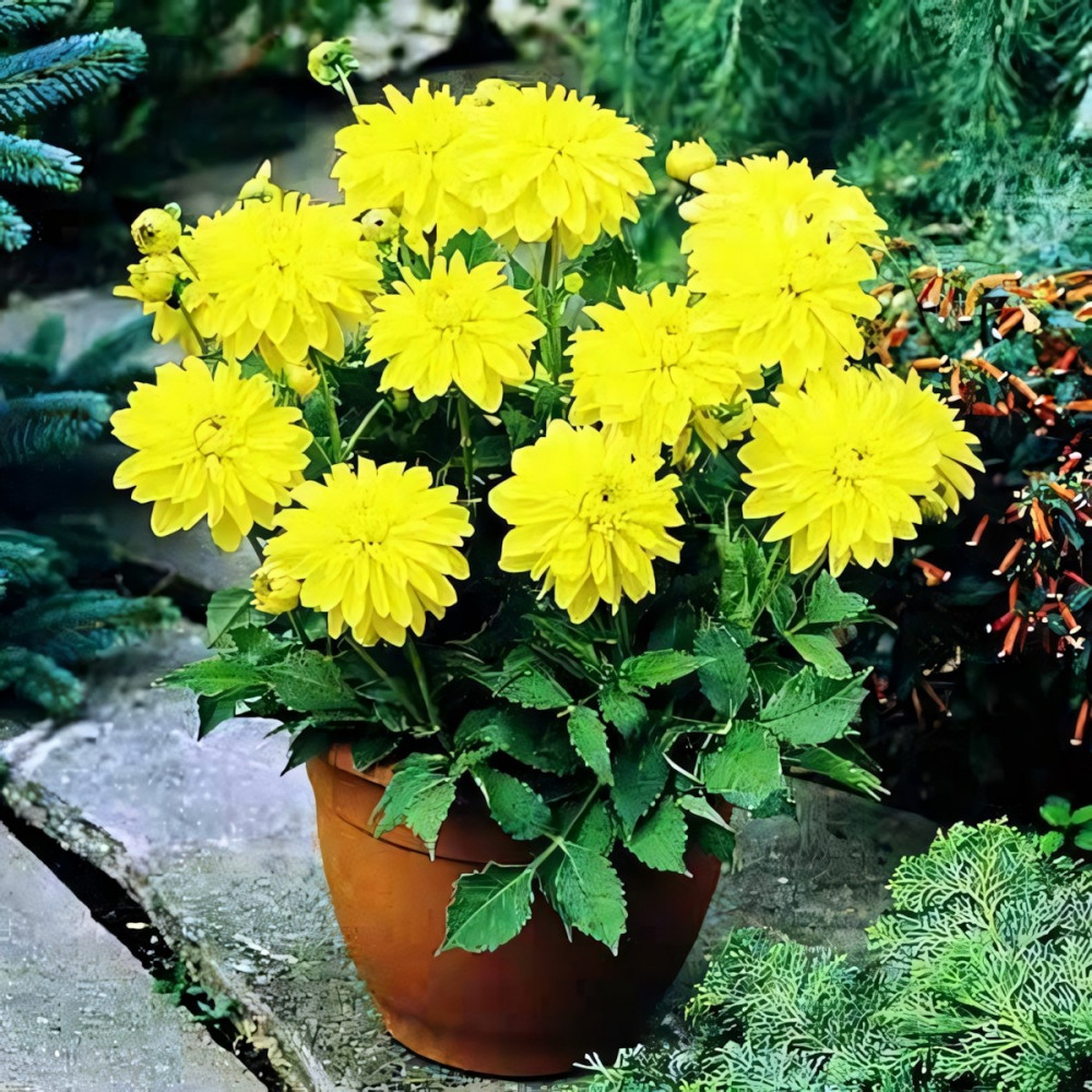 Георгина декоративная низкорослая Melody Latin (Мелоди Латин)- бордюрное растение. Цветки пышная корзина 10 см, лимонного цвета. Высота 40-50 см. Подходит для патио. Цветение обильное и продолжительное.