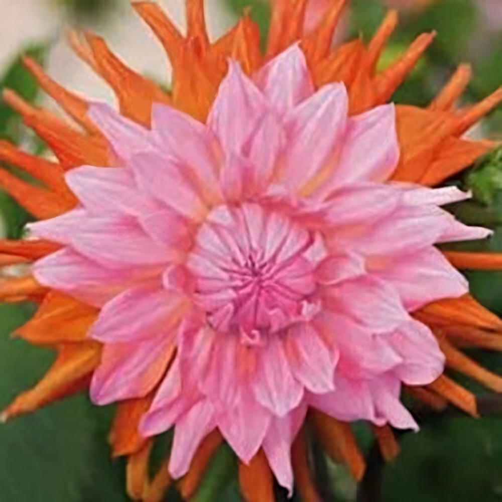 Георгина декоративная Okapi's Sunset (Окапи Сансет) - переливчатые светящиеся шары. Каждое соцветие имеет золотистое основание, плавно переходящее в сочный оранжево-розовый центр. Верхнюю треть лепестков покрывает белоснежная глазурь! Куст мощный, пышный, стебли полые высотой 70 см. Листья перистые, темно-зеленые, многочисленные. Соцветие махровое, светло-розовое с пылающим оранжевым центром. Нижние лепестки оранжевые, скрученные. Лепестки плоские, слегка закрученные и отогнутые к стеблю. Диаметр цветка - 10-15 см. Предпочитает солнечные места, защищенные от ветра, плодородные хорошо дренированные почвы. Используется для групповых посадок и на срезку. Цветет с июля по октябрь. Устойчива к неблагоприятным условиям роста, к болезням и вредителям.