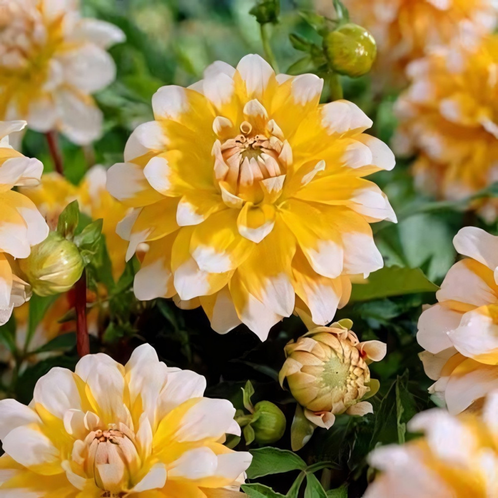 Георгина декоративная Seattle (Сиэттл) - станет прекрасным дополнением любого бордюра, клумбы или букета. Привлекательные солнечные крупные махровые цветы желтого окраса с белыми кончиками поднимут Вам настроение. Высота растения 80-100 см.Сорт нетребователен, устойчив к заболеваниям. Легок в выращивании.