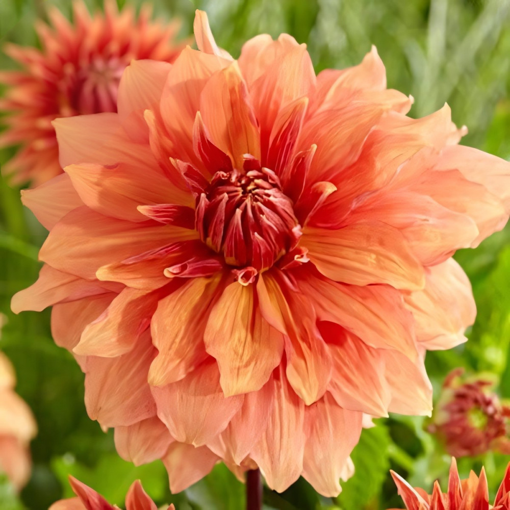 Георгина декоративная макси Mango Madness (Манго Мэднесс) крупноцветковый сорт. Высокие прочные стебли украшают махровые цветы, поистине гигантского диаметра. Очаровательные цветки нежно-лососевого оттенка имееют красные штрихи и прожилки. Является великолепным украшением любого сада. Цветет продолжительно с июля по октябрь. Для более обильного цветения удаляют боковые бутоны. Идеально подходит для срезки. Высаживают георгины на хорошо освещенных, защищенных от ветра местах. Предпочитают легкую, плодородную землю. Георгины неприхотливы и легки в выращивании. Размножение происходит путем деления клубней. На зиму клубни выкапывают, просушивают и хранят в сухом прохладном месте. Количество в упаковке 1 шт.