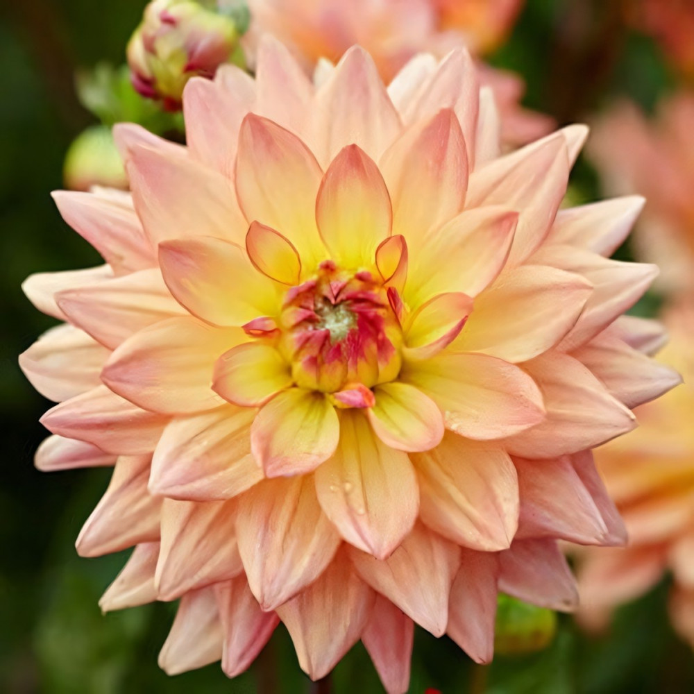 Георгина мелоди Dora (Дора) относится к группе бордюрных (низкорослых) георгин. Цветок апельсиново-лососевого цвета, с желтыми лепестками у основания и красной серединой. Отличительная черта этого вида георгин в том, что их не надо подвязывать и удалять боковые побеги. Они растут пышным невысоким кустиком. Непрерывно и продолжительно цветут, вплоть до самых заморозков. Прекрасно растут в вазонах и горшках. Служат для украшения террас, балконов и веранд. Очень эффектно смотрятся на внешней стороне бордюра. Высаживают георгины на хорошо освещенных, защищенных от ветра местах. Предпочитают легкую, плодородную землю. Георгины неприхотливы и легки в выращивании. Размножение происходит путем деления клубней. На зиму клубни выкапывают, просушивают и хранят в сухом прохладном месте. Количество в упаковке: 1 шт.