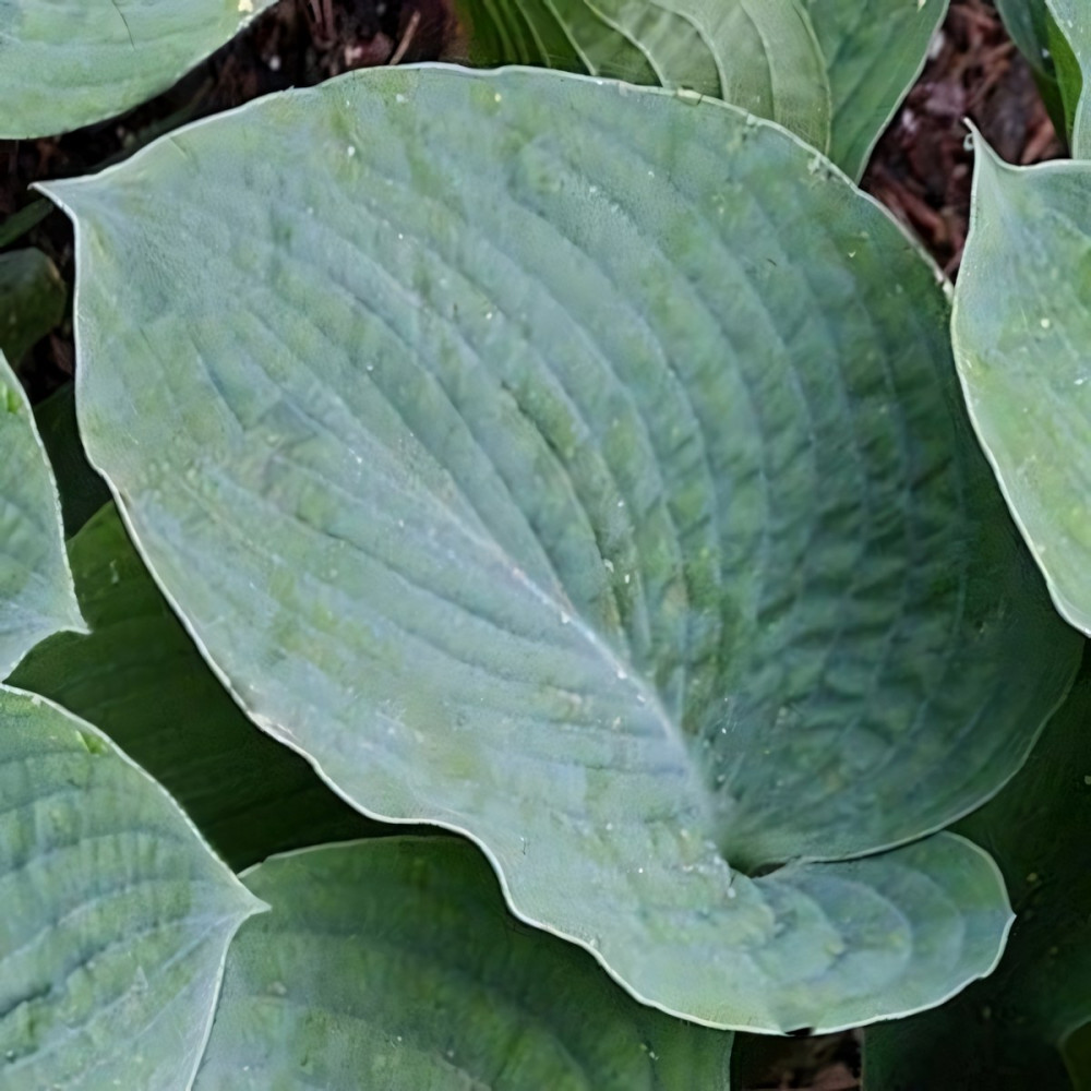 Один из самых «синих» эффектных сортов хост. Листья ребристые, чашевидные, широкие, цветки крупные, белые, цветёт обильно. Хорошо разрастается.