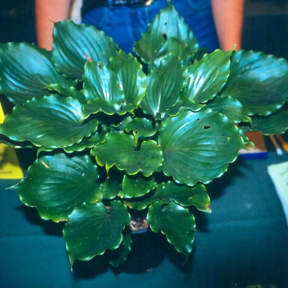 Средняя хоста. Листья сердцевидные, очень толстые, блестящие, с глубоким жилкованием, тёмно-зелёные с изумительной гофрировкой по краю. Цветы лавандовые.