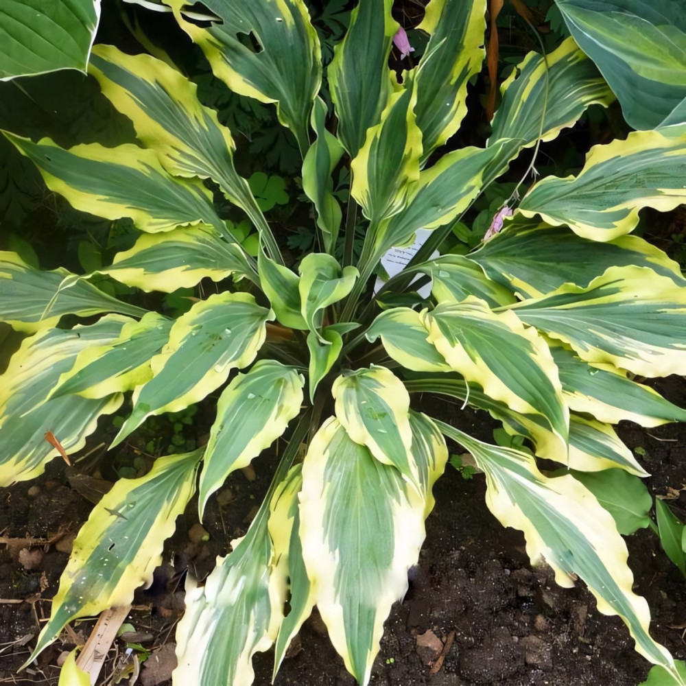 У этой хосты плотная, длинная, волнистая листва очень красивой расцветки. Зелено-голубую середину обрамляют сливочные языки-полоски, которые заходят на середину листа. С каждым годом она становится красивееи красивее.