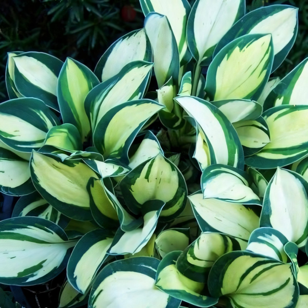 Эта хоста имеет аккуратные плотные овальные листья. Сливочно-кремовый центр со временем меняется на белый. Сине-зеленая, не регулярная кайма.
