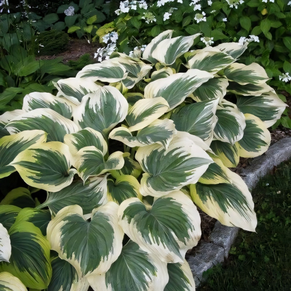 Гигантская хоста. Листья очень плотной текстуры, глянцевые, ниспадающие, с волнистыми краями; зеленые с кремовой каймой, которая постепенно становится светлее. Цветки лавандовые.