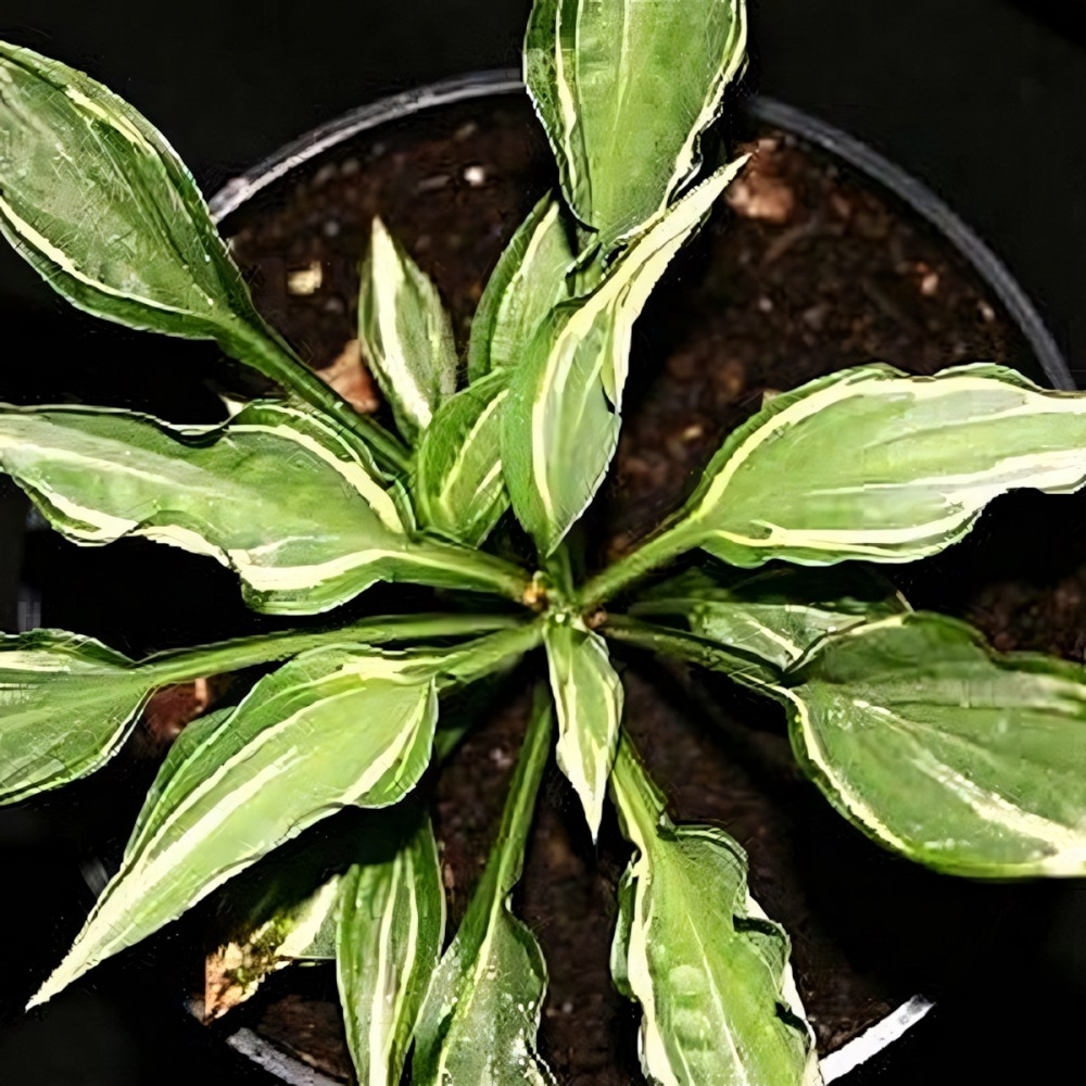 Листья стреловидные, плотные, волнистые, тёмно-зелёные с молочно-зеленоватым центром, который преображается в золотистый. Белоснежной границей разделяет два цвета. Цветы светло-лавандовые.