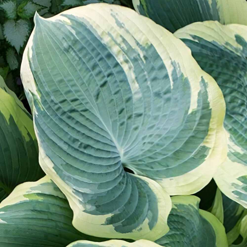 Замечательная, крупная хоста, которая украсит любой сад. Листья большие сине-зеленые, гофрированные, с широкой неравномерной кремово-желтой каймой. Цветки белые.